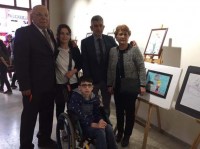 tekerlikli sandalyesiyle sergide gezerken kendi resmini görünce çok mutlu