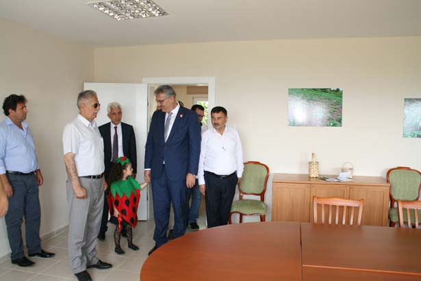 Törenin ardından protokol, Osmanlı Çileği Yetiştiriciliği Proje Alanı hizmet binasında incelemelerde bulundu.