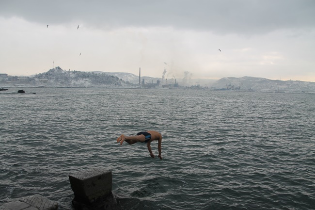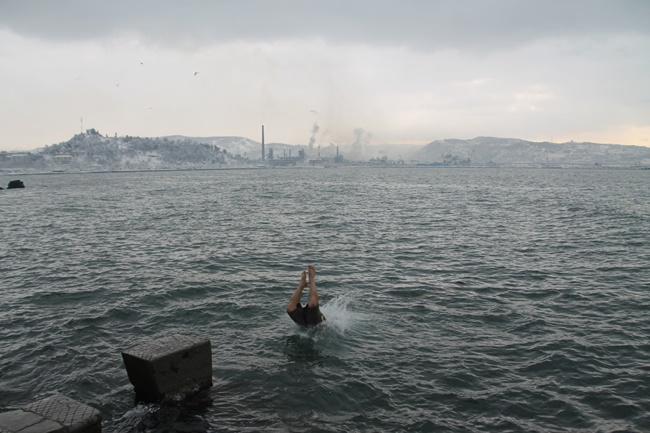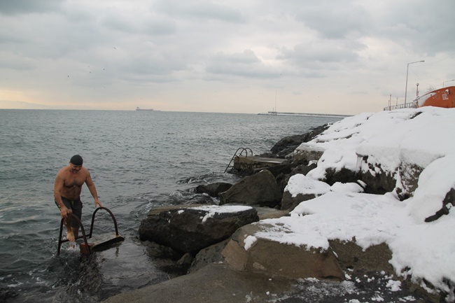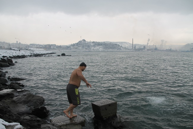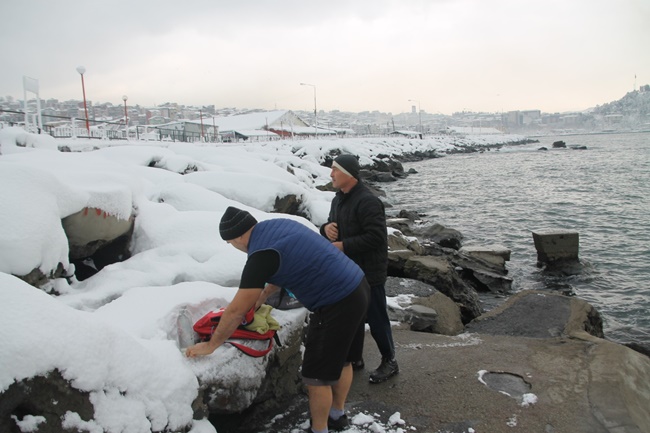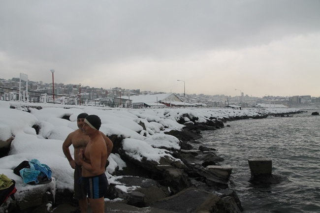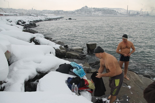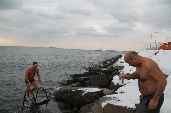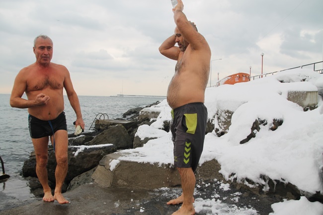 Ereğli ‘de esnaflık yapan Sinan Sarıoğlu ile Ereğli Şoförler ve Otomobilciler esnaf odası başkanı Cevdet Civelek, Bozahane mevkiinde termometreler -4 ü gösterirken denize girdi. Sinan Sarıoğlu ile Bozahane mendirek alanına gelen Civelek hazırlıklarını yaptıktan sonra Sarıoğlu ile birleşikte denize atladı. Civelek denize atlamadan önce yaptığı açıklamasında ‘Herkesin ayrı bir keyfi var. Bizim de bu. Bu havada denize girmek bizleri dinç tutuyor” dedi.
