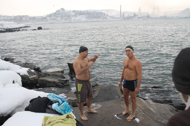 Zonguldak’ın Ereğli ilçesinde ile Ereğli Şoförler ve Otomobilciler Esnaf Odası Başkanı Cevdet Civelek ve esnaflık yapan Sinan Sarıoğlu termometreler -4 ü gösterirken denize girdi. Civelek konuşmasında ‘Herkesin ayrı bir keyfi var. Bizim de bu. Bu havada denize girmek bizleri dinç tutuyor” dedi.