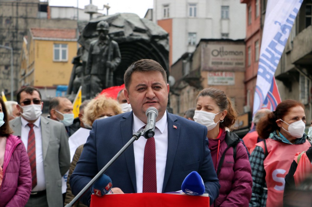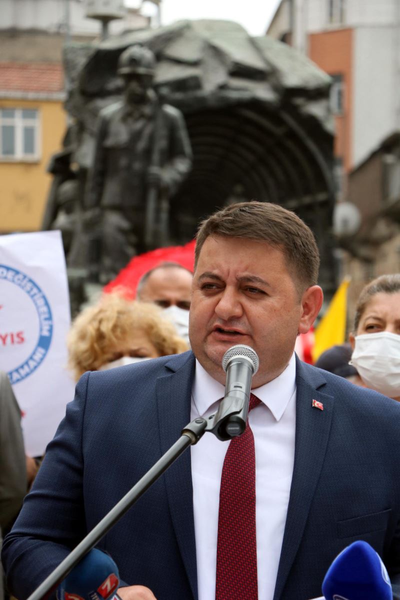 Meydanlarda övünerek toplum sağlığını yok sayarak yaptıkları kongrelere yasalar işlemedi. İşçilere ‘Maske taktırmıyorsunuz’ serzenişlerinde bulunan Sağlık Bakanı sıra kongrelere geldiğinde konuşamadı. Bu dönemde bile birilerine servet, emekçilere yoksulluk kaldı. Sıra Ulusal Bayramlara (Cumhuriyet Bayramı, 23 Nisan Ulusal Egemenlik ve Çocuk Bayramı, 19 Mayıs Gençlik ve Spor Bayramı, 30 Ağustos Zafer Bayramı’na) ve emekçilerin Birlik ve Dayanışma günü 1 Mayıs’ı kutlamaya gelince yasaklamalar devreye girdi. Bu durumu şiddetle protesto ettiğimizi buradan sizlerin huzurunda haykırıyoruz” dedi.