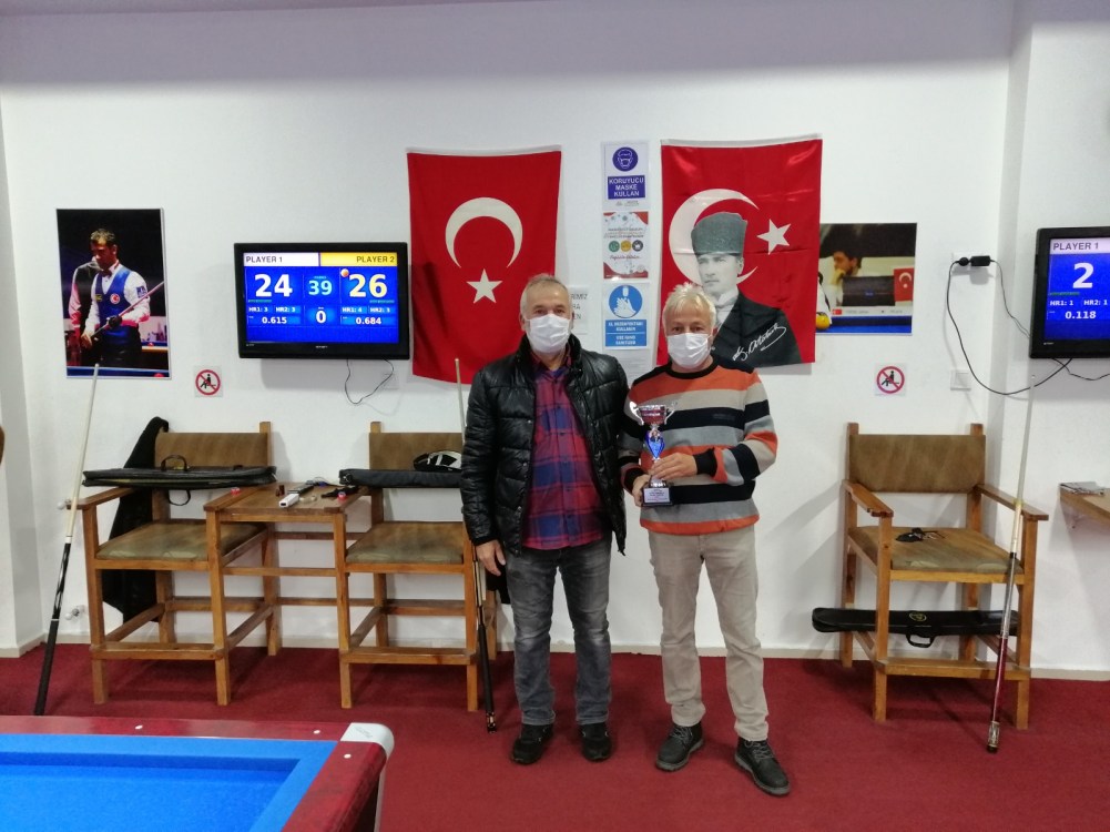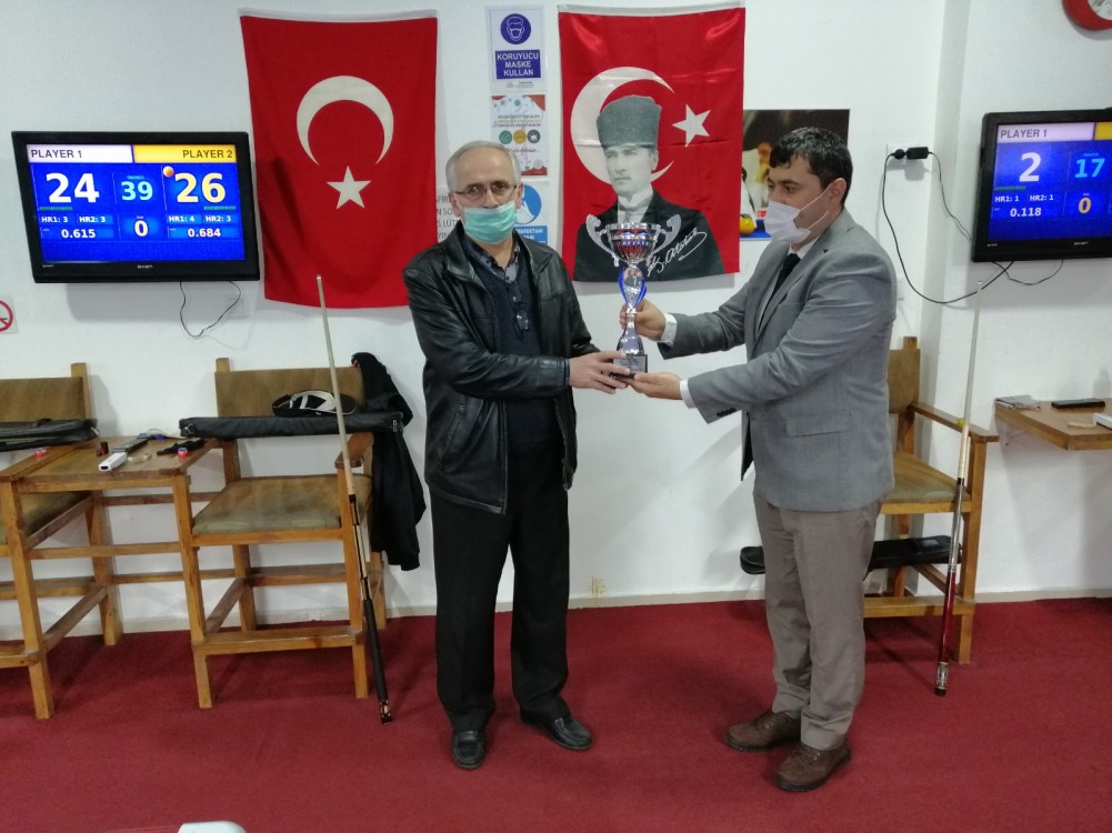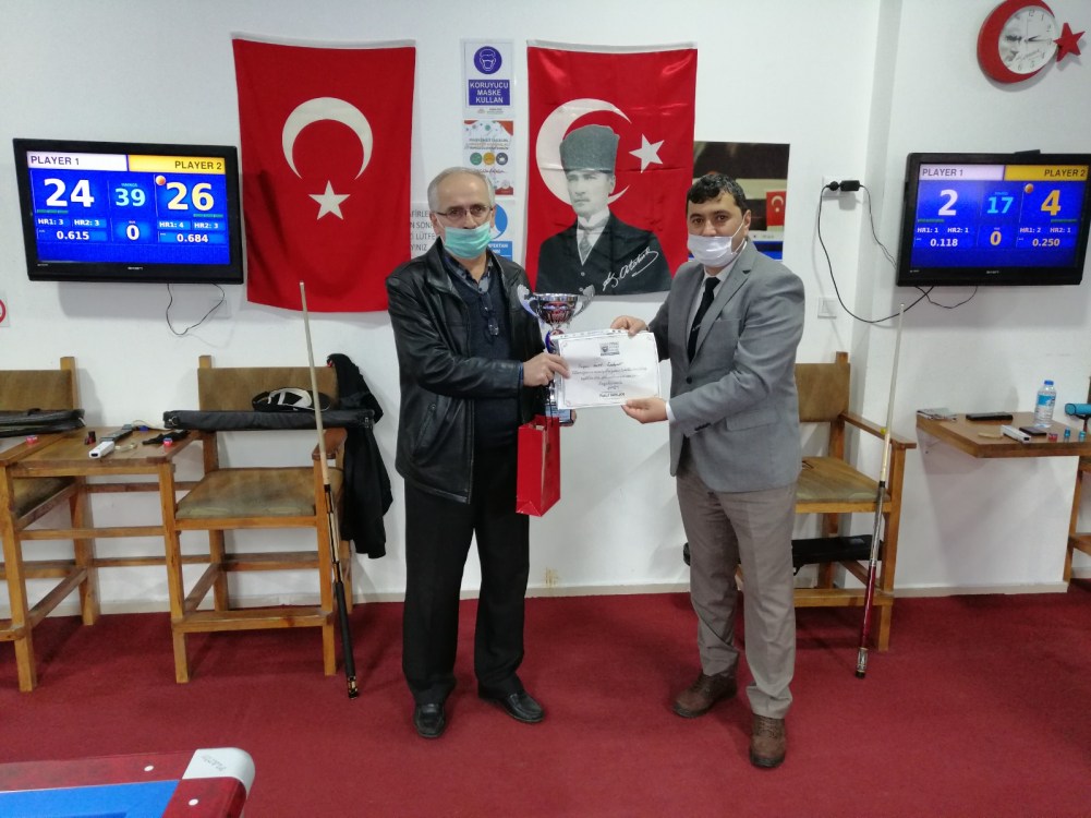 Özdemir ile Basmaz’ın bir kez daha karşı karşıya geldikleri maçı kazanan usta ıstaka İzzet Özdemir, “10 Kasım Atatürk’ü Anma Özel 3 Bant Bilardo Turnuvası”nda şampiyonluğa ulaşan isim oldu.