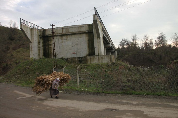 Karadeniz Ereğli-Devrek yolu çalışmaları kapsamında Ova köyü çıkışında yaklaşık 2 sene önce yapılan ve yarım bırakılan köprü çalışmasının altından sırtındaki mısır yükü ile geçen yaşlı kadın, köprünün iki sene önce yapılıp bu şekilde kaldığını, yolun yapılması durumunda işlerinin daha da kolaylaşacağını söyleyerek uzaklaştı.