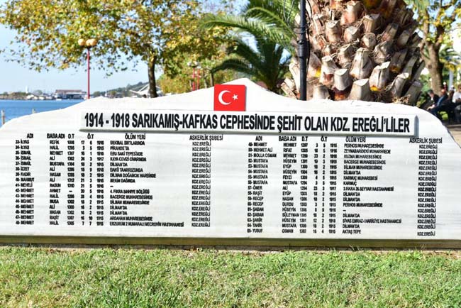 1.Dünya Savaşı devam ederken, İstanbul’dan hareket ederek Kafkas Cephesi’ne yardım götüren ancak 7 Kasım 1914 sabahı Karadeniz Ereğli açıklarında Rus Savaş gemilerince batırılan Bezm-i Alem, Bahr-i Ahmer ve Mithat Paşa gemilerinde şehit olan ve tarihe Sarıkamış Deniz Şehitleri olarak geçen 221 şehit için Karadeniz Ereğli Belediyesi tarafından sahil bandında yaptırılan ‘Sarıkamış Deniz Şehitleri Anıtı’nda 109’uncu yılında anma töreni düzenlendi.