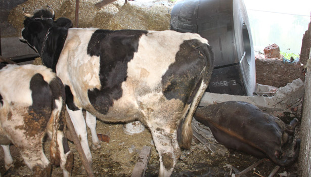 ahırın içine düştü. Ahırda bulunan 3 inekten bir tanesi sac rulosunun altında