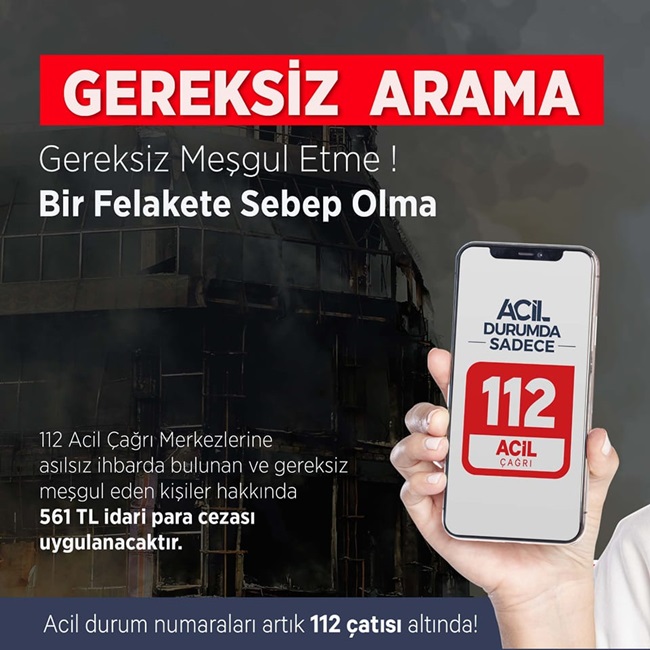 112 Acil Çağrı Merkezimizi arayarak asılsız ihbarda bulunan ve gereksiz yere meşgul eden kişiler hakkında 561,00-TL idari para cezası uygulamasına devam edilmektedir.