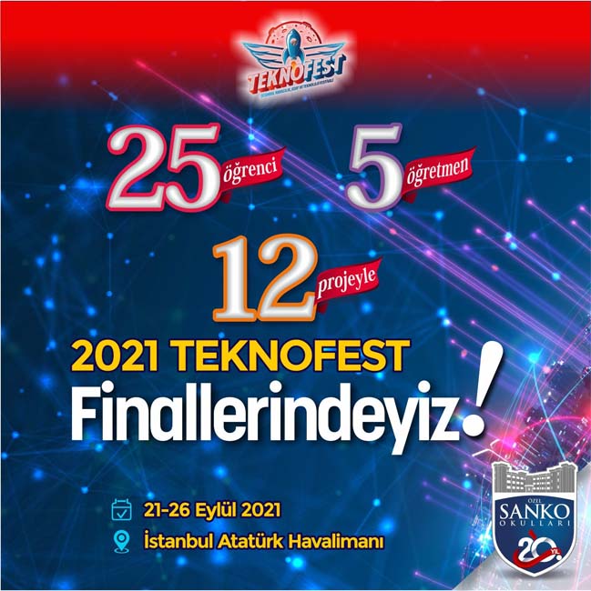 İstanbul Atatürk Havalimanı’nda 21-26 Eylül tarihlerinde düzenlenecek TEKNOFEST 2021 finallerinde SANKO öğrencileri, “İnsanlık Yararına Teknolojiler Kategorisi”nde ilkokullarda iki, ortaokullarda sekiz ve liselerde iki olmak üzere toplam 12 proje ile yarışacak.