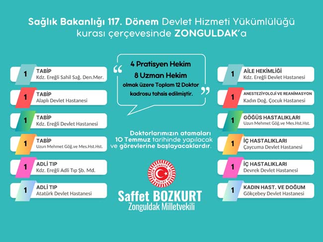 “Sağlık Bakanlığı 117. Dönem Devlet Hizmeti Yükümlülüğü kurası çerçevesinde ZONGULDAK’a 4 Pratisyen Hekim ve 8 Uzman Hekim olmak üzere Toplam 12 Doktor kadrosu tahsis edilmiştir.