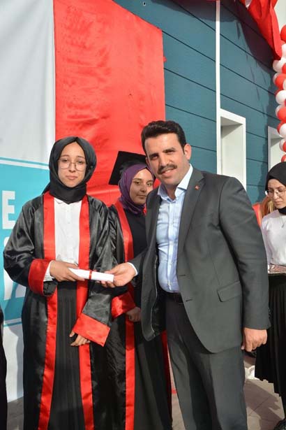 Kdz. Ereğli Fazlı Erdoğan Kız Anadolu İmam Hatip Lisesi, 2018-2019 eğitim öğretim yılında mezun olan 135 öğrenci düzenlenen törende büyük sevinç yaşadı. Okul bahçesinde düzenlenen törene Kdz. Ereğli Kaymakamı İsmail Çorumluoğlu, İlçe Milli Eğitim Müdürü İsmail Aksoy, AK Parti İlçe Başkanı Fatih Çakır, İlçe Milli Eğitim Şube Müdürü Vedat Sever ile Reşat Atar, okul müdürleri, öğretmenler öğrenciler ve veliler katıldı. Saygı duruşunda bulunulması ve İstiklal Marşı'nın okunması ardından başlayan programda konuşan Kdz. Ereğli Fazlı Erdoğan Kız Anadolu İmam Hatip Lisesi Müdürü Leyla Özer, öğrencilerin bundan sonra ki hayatlarında başarılı olmasını temenni etti. Müdür Özyer konuşmasında şu ifadelere yer verdi, "2018-2019 eğitim-öğretim yılında eğitim hayatına başlayan okulumuzun ilk mezunlarını yetiştirmenin haklı gururu içerisindeyiz. Bu mutluluğu çok kıymetli misafirlerimizle paylaşmaya gönüldaş olduğunuz için hepinize teşekkür ediyorum. Okulumuzun ilk açıldığı günlerden bu kutlu güne gelmenin heyecanıyla şöyle bir geriye dönüp baktığım zaman şunları görüyorum, pes etmemek, engelleri kararlılıkla aşmak, sarsılmaz irade ve en önemlisi merhamet. Sevgili gençler, cumhuriyetimizin kurucusu Mustafa Kemal Atatürk'ün işaret ettiği çağdaş uygarlığı yakalama ve asra imzamızı atabilmek için az önce bahsettiğim ilkeler sizi başarıya götürecek dominonun taşlarıdır. Sizler kutlu yolun yolcuları olarak ülkemizi ve ulusumuzu daha ileriye taşıyacak ideal gençlik Merhum Akif'in deyimiyle, Asım'ın nesli olacaksınız. Sevgili Gençler, bugün oku emrine uyarak başladığınız yolculuğun en önemli aşamasını bitirdiğiniz gün. Yaşadığımız çağ ise küreselleşme çağı. Küreselleşirken köklerimizi unutursak, kimliğimizi yeterince tanıyamazsak bir boşluğa düşeriz, bir kimlik bunalımı içerisine gireriz. Bu nedenle sizlerin ufkunuzu geniş tutmanız, Bağdat'tan Semerkant'a, Balkanlar'dan Endülüs'e kuşatıcı bir ufukla Türkiye'ye ve Dünya'ya bakmanız gerekiyor. Mevlana'nın dediği gibi pergelin bir ayağı bu coğrafyada olsun. O zaman hiç yalpalanmayacaksınız. Neyim, kimim, ne için yaşıyorum? diye sormayacaksınız. Şunu hiçbir zaman unutmayın. Hayat sizden öncekileri sınadığı gibi sizleri de sınayacaktır. Değerli öğrencilerim okulumuzun açıldığı ilk dönemlerde hep birlikte yaşadığımız çeşitli sıkıntıları düşünün. Pes etmedik, el ele vererek çözdük bütün sorunları. İyi günde, kötü günde sırtımızı birbirimize dayadığımız zor günlerden bizleri bugüne ulaştıran yüce rabbime şükürler olsun. İyi ki bu okulda yöneticilik hayatıma merhaba demişim. İyi ki sizler gibi asil ruhlu cömert öğrencilerim olmuş. İyi ki sizler ilk göz ağrım olmuş. O kadar çok iyi kilerim var ki kelimeler kifayetsiz kalıyor bazen. Bundan sonra ki hayatınız hep başarı, merhamet, insan sevgili idealiyle dolsun taşsın. Evet gençler, birazdan mezun olacaksınız. Yapmanız gereken en önemli vazife Allah'ın kulu olmak, Peygamber Efendimizi rehber edinmek, vatanımızı korumak ve yüceltmek. Her ayrılış kelama atılan bir adımdır. Adımlarınızı sağlam atın ki, iz bırakasınız. Okulumuzda sizleri en iyi yetiştirebilmek için canla başla çalışan öğretmenlerinizi hiçbir zaman unutmayın. Kapımız sizlere her zaman açık olacaktır. Sözlerime son vermeden önce imam hatip okullarının açılmasında büyük katkısı olan Celalettin Ökken Bey ve Tevfik İleri Bey'e Allah'tan rahmet diliyorum. Yine imam hatip liselerinin açılmasında maddi manevi büyük katkıları olan nice hayır severimize ve okulumuzun yapım aşamasında maddi manevi büyük emeği olan 22. 23. Dönem milletvekili, hayır sever işadamı Fazlı Erdoğan Bey'e, okulumuzun farklı işlemlerinde bizlere katkı sunan, her zaman desteğini hissettiğimiz, bize bir telefon kadar yakın olan AK Parti İlçe Başkanı Fatih Bey'e yine desteklerini her zaman gördüğümüz, Kdz. Ereğli Belediye Başkanlığı, İlçe Kaymakamlığı, İlçe Müftülüğü, İlçe Milli Eğitim Müdürlüğüne, değerli şube müdürlerimize ve emeği geçen bütün kurum ve idarecilerimize sonsuz şükranlarımızı sunuyoruz. Sevgili gençler bundan sonra ki hayatınızda başarılar diliyorum. Yolunuz açık olsun."