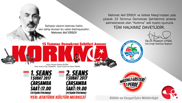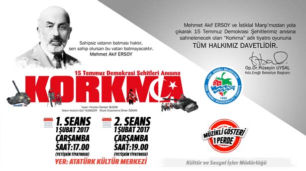 Belediye Başkanı Hüseyin Uysal, Milli Şairimiz Mehmet Akif Ersoy ve İstiklal Marşı'mızdan yola çıkarak 15 Temmuz Demokrasi Şehitleri anısına sahnelenecek olan 'Korkma' adlı tiyatro oyuna tüm Ereğli halkının davetli olduğunu belirtti.