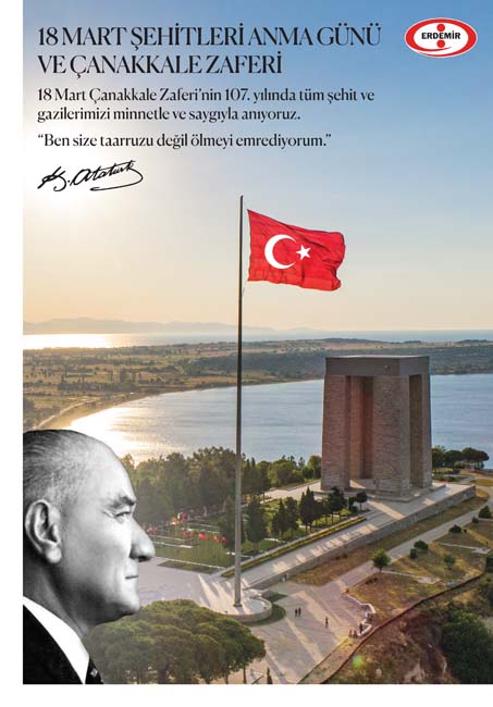 Karadeniz Ereğli'de faaliyet gösteren Ereğli Demir ve Çelik Fabrikaları (ERDEMİR), “18 Mart Şehitleri Anma ve Çanakkale Zaferi’’ dolayısıyla bir mesaj yayımladı.