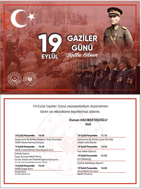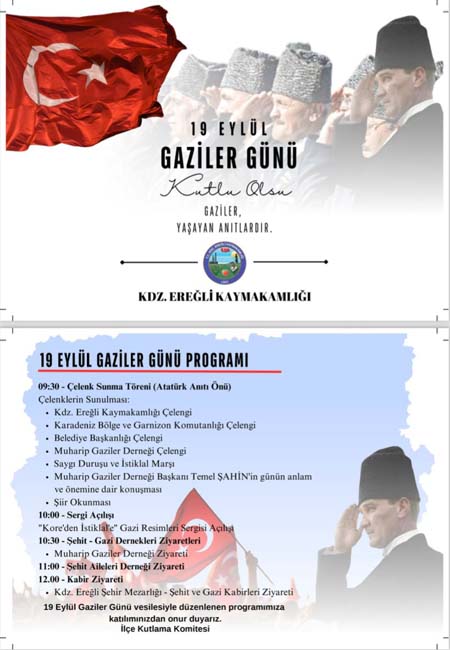 19 Eylül Gaziler Günü tüm yurtta olduğu gibi Zonguldak Kdz.Ereğli’de de kutlanacak. Zonguldak ve Kdz.Ereğli’de kutlanacak olan 19 Eylül Gaziler Günü kutlama programını okuyucularımız ile paylaşıyoruz.