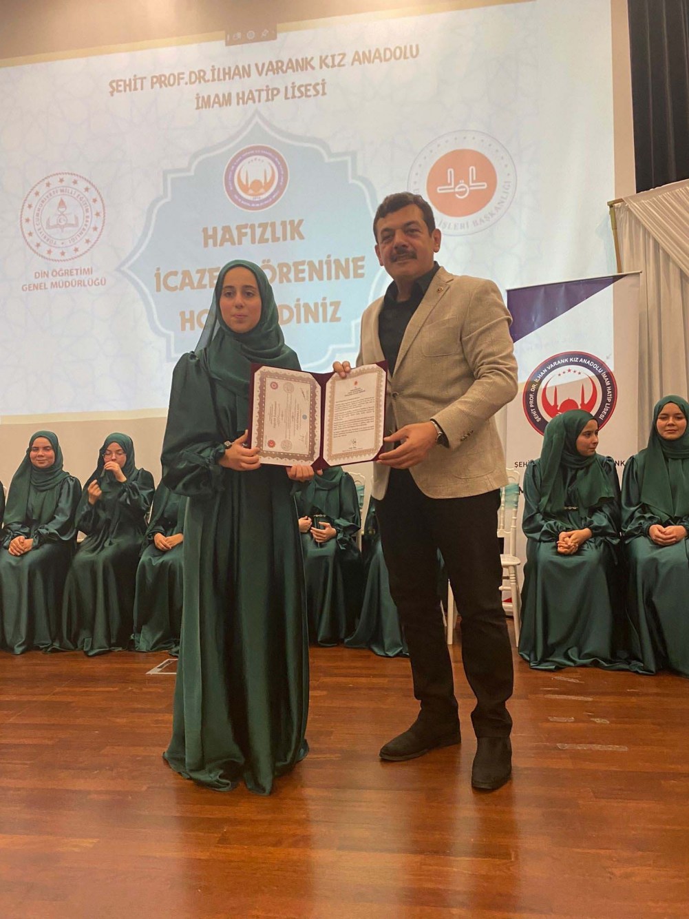 Şehit Prof. Dr. İlhan Varank Kız Anadolu İmam Hatip Lisesi'nde hafızlık eğitimini tamamlayan 19 hafız için icazet töreni düzenlendi. Törene AK Parti Zonguldak Milletvekili Muammer Avcı, Milli Eğitim Müdürü Osman Bozkan, İl Müftüsü Aşır Durgun'un yanı sıra kurum amirleri, siyasi parti temsilcileri, sivil toplum kuruluşu temsilcileri ve aileler katıldı.