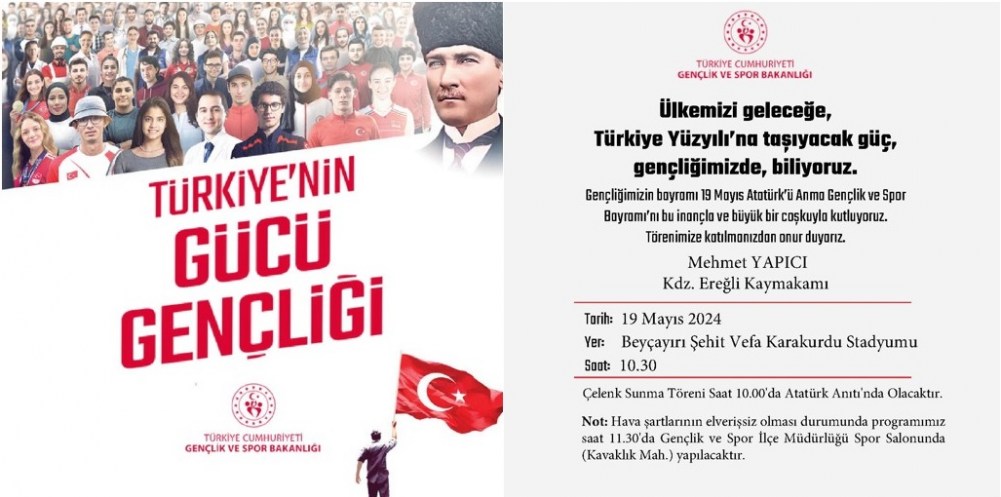 19 Mayıs Atatürk’ü Anma Gençlik ve Spor Bayramı etkinlikleri kapsamında, Kdz. Ereğli Kaymakamlığı tarafından hazırlanan kutlama programı “Ülkemizi geleceğe, Türkiye Yüzyılı’na taşıyacak güç, gençliğimizde biliyoruz. Gençliğimizin bayramı 19 Mayıs Atatürk’ü Anma Gençlik ve Spor Bayramı’nı bu inançla ve büyük bir coşkuyla kutluyoruz. Törenimize katılmanızdan onur duyarız” sözleriyle başlıyor.
