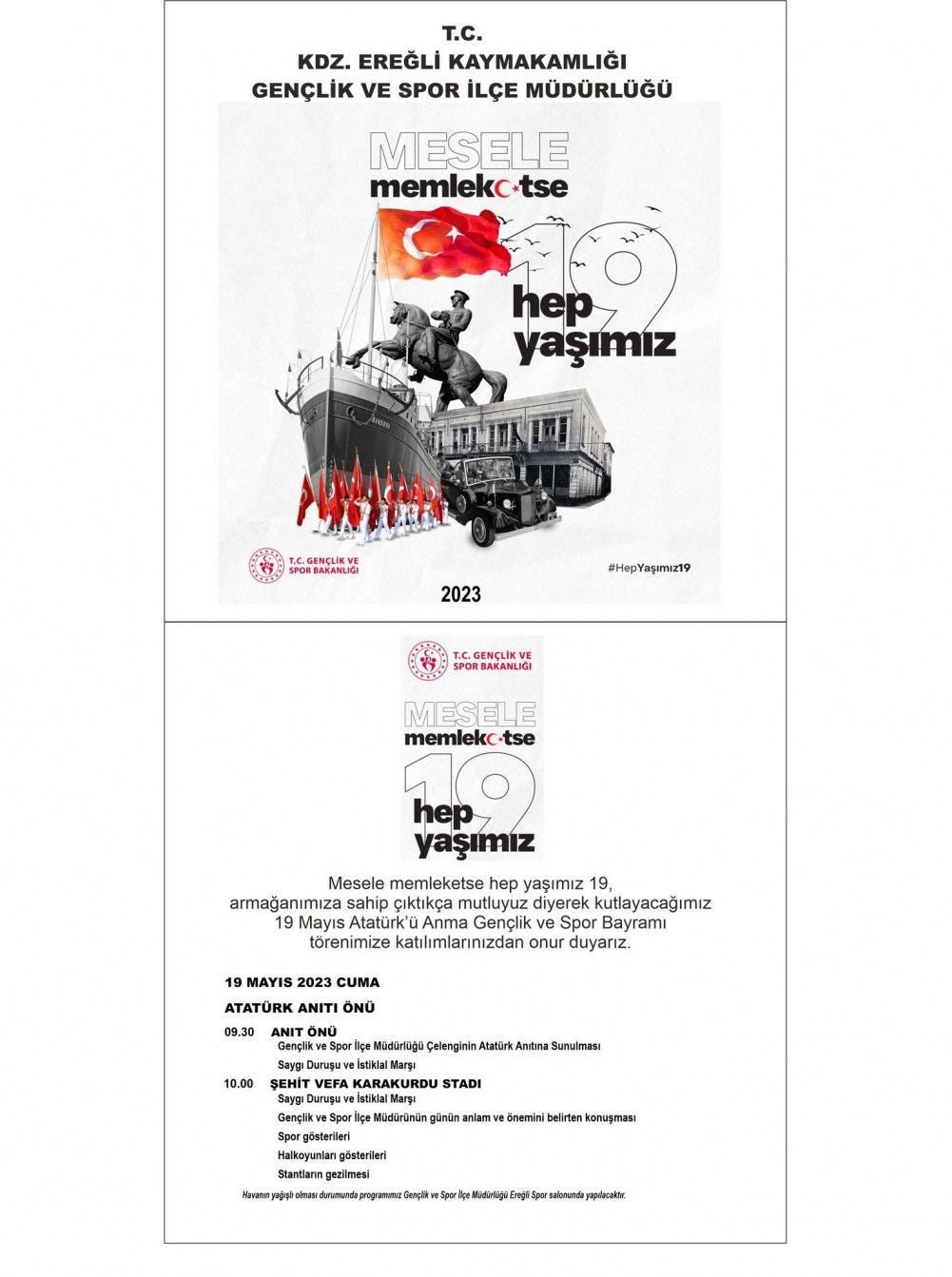 Karadeniz Ereğli’de Gençlik ve Spor İlçe Müdürlüğü tarafından hazırlanan 19 Mayıs Atatürk’ü Anma, Gençlik ve Spor Bayramı programı, 19 Mayıs 2023 Cuma günü saat 09.30’da Atatürk Anıtı önünde başlayacak. Gençlik ve Spor İlçe Müdürlüğü çelenginin Atatürk Anıtı’na sunulmasının ardından saygı duruşunda bulunulacak, İstiklal Marşı okunacak.