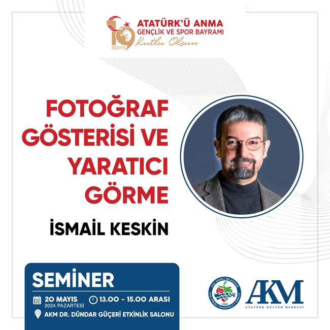 Doç. Dr. İsmail Keskin tarafından saat 13.00 – 15.00 arasında da Dr. Dündar Güçeri Etkinlik Salonu’nda Fotoğraf Gösterisi ve Yaratıcı Görme Semineri düzenlenecek.