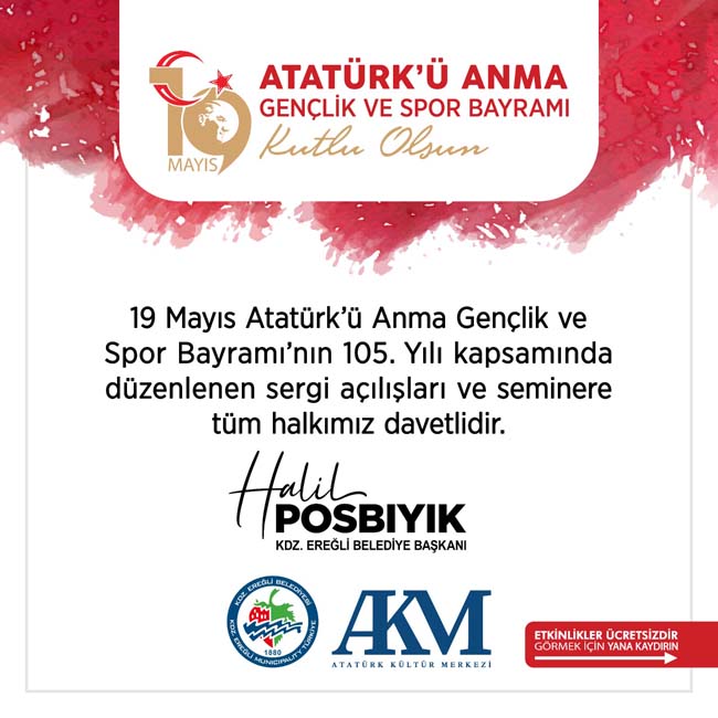 Kdz. Ereğli Belediyesi tarafından 19 Mayıs Atatürk’ü Anma Gençlik ve Spor Bayramı’nda özel sergi ve seminer düzenlenecek.