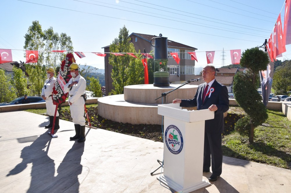 Saygı duruşu ve İstiklal Marşı’nın okunmasının ardından törende ilk konuşmayı yapan Genel Maden İşçileri Sendikası (GMİS) Genel Başkan Yardımcısı İsa Mutlu, kurumda bugünlerde yaşanan ekonomik sıkıntının aşılması için üretimin ve doğal kaynakların kullanılması gerektiğini söyledi. Mutlu konuşmasında “1829 yılında Uzun Mehmet'in kömürü bulmasıyla dikkatleri üzerine çeken bölgede, 1848 yılında resmi üretimin başladığı, demir çelik fabrikaları ve enerji santrallerinin kurulmasıyla da Zonguldak'ın emeğin başkenti ismini aldı. TTK’nın kuruluş kapasitesi yılda 5 milyon ton satılabilir taşkömürü üretmektir. En kısa zamanda bu hedefe ulaşmanın planlamasını yapmak, işçi açıklarımızı gidermek zorundayız. Bugün yaşadığımız ekonomik krizi en kısa zamanda aşmanın yolunun, üretmekten ve kendi doğal kaynaklarımızı değerlendirmekten geçtiğini artık herkes görüyor. Cumhuriyetimizin ilk yıllarında ülkemizin sanayisinin ve ekonomisinin gelişimi için uygulanan yerli ve milli üretim politikalarının sıkça konuşulduğu günümüzde Zonguldak’a ve TTK’ya da yatırımların yapılması ve işçi açıklarının biran önce giderilmesi gerekiyor. Türk-İş öncülüğünde, kölelik düzeni anlamına gelen bu düzenlemeye karşı mücadelemizi sürdürüyor, ülkemizin çalışma hayatının geleceğine sahip çıkıyoruz. Torba yasada yer alan ve emeğe kölelik dayatan düzenlemelerin yer aldığı maddelerin geri çekilmesini istiyoruz. Sanayimizin geliştiği yıllarda emeğe ve alın terini akıtan emekçiye verilen değerin karşılığı olan hakların, bugün ellerinden alınmaya çalışılması kabul edilemez” dedi.