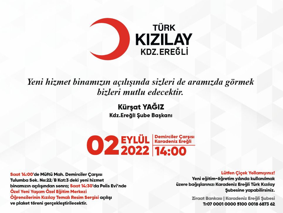 Kızılay Karadeniz Ereğli Şubesi yeni hizmet binası açılış davetiyesinde törene çiçek yollanmaması rica edilirken yeni eğitim öğretim yılında kullanılmak üzere Karadeniz Ereğli Türk Kızılay Şubesine bağış yapılabileceği belirtildi. Bağışlar için; Ziraat Bankası Karadeniz Ereğli Şubesi TR07 0001 0000 5100 0018 6873 62 iban numaralı hesap bilgisi verildi.