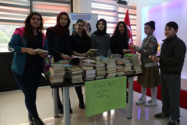 Zonguldak'ın Ereğli ilçesi İbrahim Süheyla İzmirli Fen Lisesi 9. sınıf öğrencileri, 'Kitap Kardeşliği' adı altında düzenledikleri Sosyal Sorumluluk Projesi kapsamında topladıkları kitapları 2 köy yumurtası karşılığında Kurtlar Ortaokulu öğrencilerine verdi.
