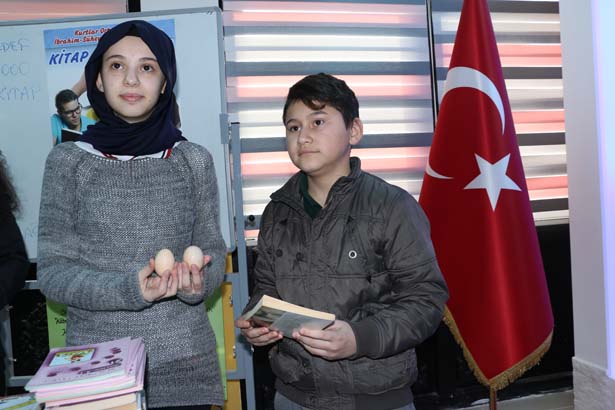 Kendilerine teşekkür ediyoruz" dedi. İbrahim-Süheyla İzmirlioğlu Fen Lisesi öğrencileri Berkay Deniz Bozkurt, Ebru Nur Gören, Gizem Nur Teke, İrem Sarıaslan ve Zeynep Demirbaş, 2 yumurtaya 1 kitap kampanyasına katılımın yüksek olduğunu, öğrenci arkadaşlarının ve ailelerinin kampanyaya sahip çıktıklarını vurguladı. Öğrenci arkadaşları adına konuşan Gizem Nur Teke "Okulumuzda sosyal sorumluluk projesi kapsamında köy okullarına kitap toplama kampanyası başlattık. Ailelerimiz ve öğrencilerimizden evde okudukları kitapları bizlere getirdiler. Bizde bugün 2 yumurta karşılığında birer kitabı okulumuza veriyoruz. Kurtlar Okulu'ndan gelen öğrenci kardeşlerimizden köy yumurtalarını alıyoruz. Yumurtaların yerine kitaplarımızı kardeşlerimize veriyoruz. Kampanyayı destekledikleri içinde teşekkür ediyoruz" dedi. Kurtlar Ortaokulu öğrencilerinden Dilara Başol ise kendileri aldıkları kitaplarla kitap okumanın tadına varacaklarını, getirdikleri köy yumurtaları ile de Fen Lisesi öğrencilerinin köy yumurtasının tadına varacaklarını kaydetti. Kurtlar Ortaokulu'ndan köy yumurtalarını toplayıp gelen öğrenci ve öğretmenler, 2 yumurtaya 1 kitap al kampanyası çerçevesinde yaklaşık bine yakın köy yumurtalarını verip, kitapları teslim aldılar.