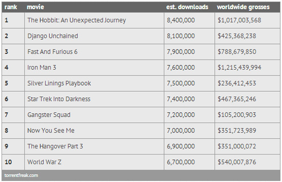 TorrentFreak 2013 yılından en çok indirilen filmleri açıkladı. Listenin ilk sırasında 8 milyondan daha fazla indirilen The Hobbit: An Unexpected Journey bulunurken, Django Unchained ikinci, Fast And Furious 6 ise üçüncü oldu.