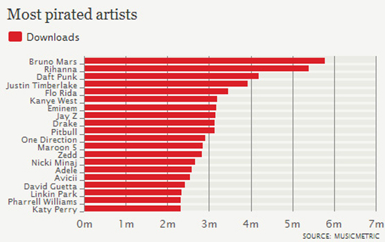En çok indirilen müzik kategorisinde ise Bruno Mars, Rihanna'yı geride bırakarak lider oluyor. Üçüncü sırada Daft Punk'ın yer aldığı listede Nicki Minaj, Katy Perry, Maroon 5 ve One Direction gibi isimler de bulunuyor.