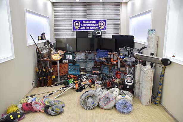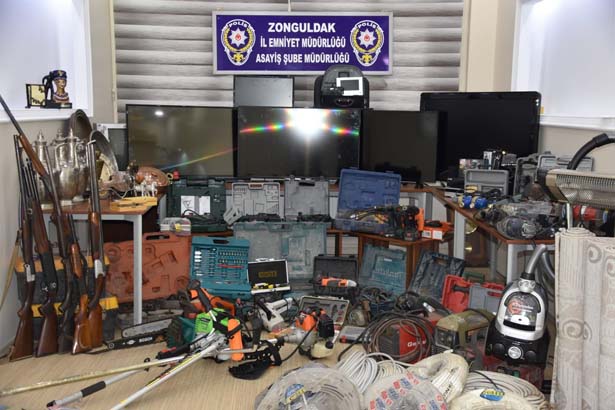 Zonguldak'ta 23 evi soyan hırsızlık çetesine yönelik düzenlenen operasyonda 100 bin TL değerinde olan 7 adet tüfek, 1 adet tabanca, 6 adet televizyon ile çok miktarda inşaat malzemesi, ev eşyası ve elektronik cihaz ele geçirildi.