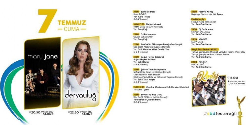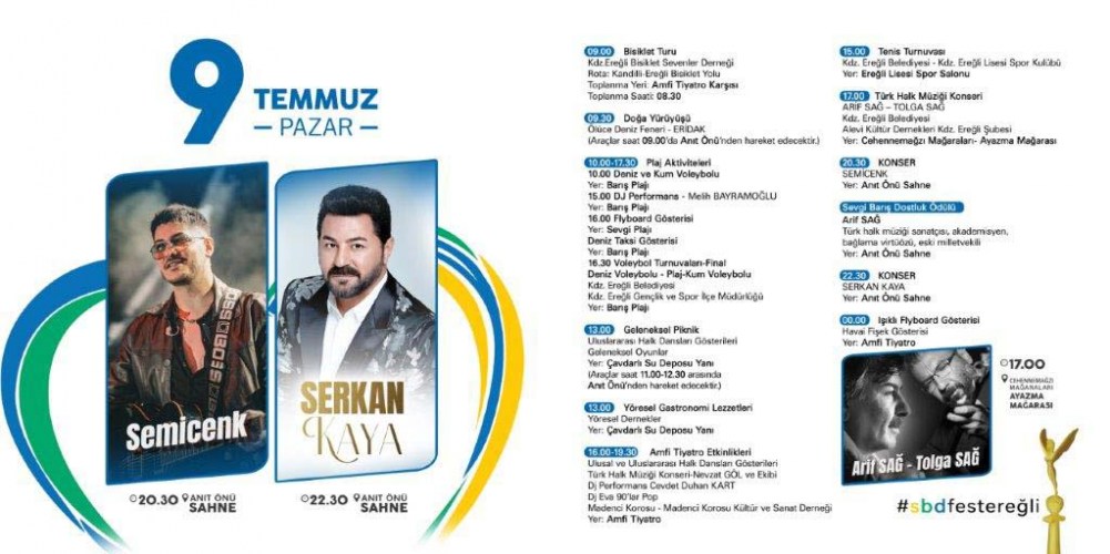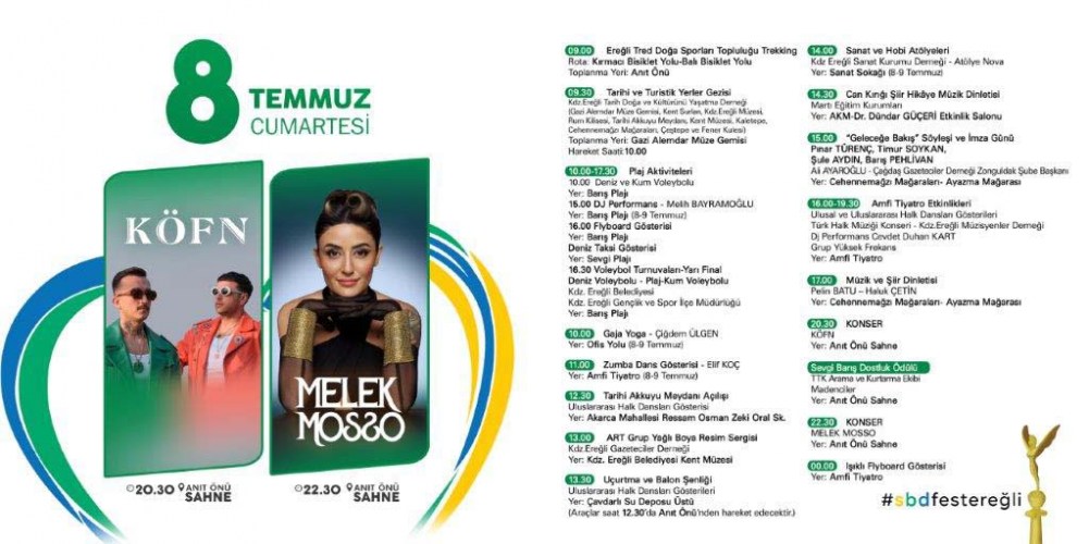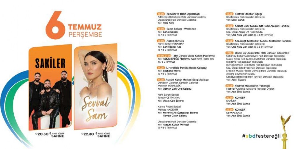 Kdz.Ereğli'de 6-7-8-9 Temmuz 2023 tarihlerinde gerçekleştirilecek olan 23. Uluslararası Sevgi Barış Dostluk Kültür ve Sanat Festivali Programı belli oldu. İşte festival programı....