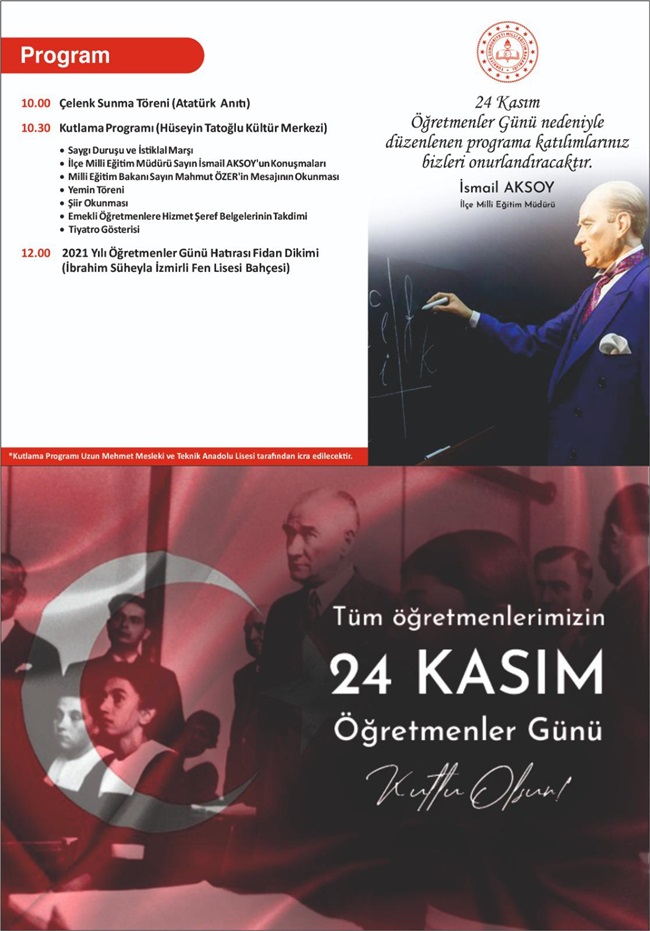 Saat 10.30’da ise Tatoğlu Kültür Merkezinde 24 Kasım Öğretmenler Günü kutlama programının ikinci bölümü gerçekleştirilecek.