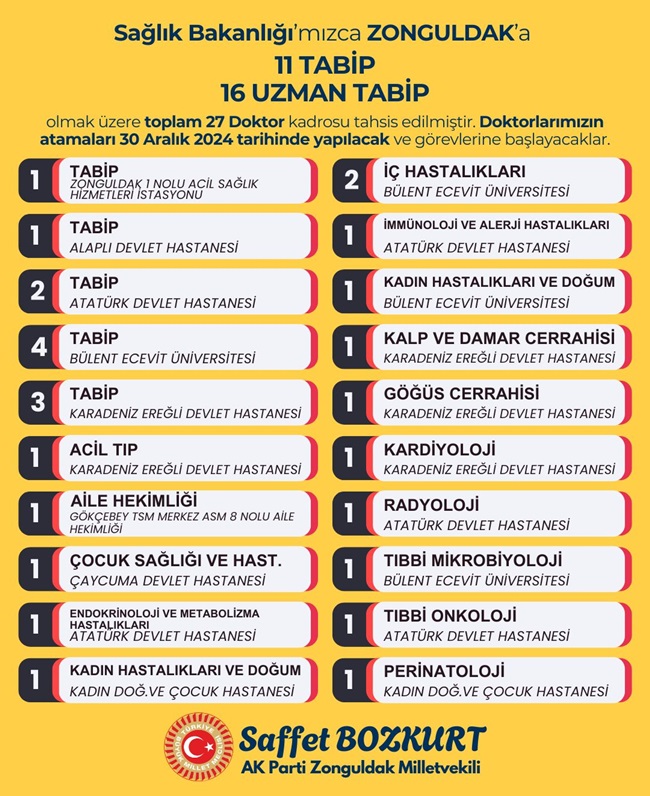 AK Parti Zonguldak Milletvekili Saffet Bozkurt, Zonguldak'a Sağlık Bakanlığı tarafından 16'sı uzman, 11'i tabip olmak üzere 27 personelin atamalarının 30 Aralık 2024 tarihinde yapılacağını ve görevlerine başlayacaklarını açıkladı
