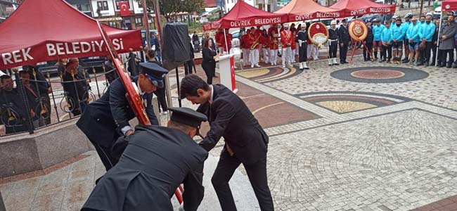 Cumhuriyet Alanında düzenlenen programa Devrek Kaymakamı Onur Alp Bıçakçı, Garnizon Komutanı Öğretmen Yüzbaşı Aykut Erdoğan ve Belediye Başkanı Özcan Ulupınar tarafından anıta çelenk sunumu ile başlanırken, çelenk sunumunun ardından saygı duruşu ve İstiklal Marşının okunmasının ardından tören sona erdi.
