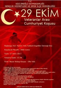 Karadeniz Ereğli Gençlik Hizmetleri ve Spor İlçe Müdürlüğü tarafından yapılan yazılı açıklamaya göre, "29 Ekim Veteranlar Cumhuriyet Koşusu Karadeniz Ereğli'de gerçekleştirilecek. 27 Ekim Cuma günü saat 15.30'da Kemer Yolu Fiziksel Engelliler Derneği önünden başlayacak olan koşu, 3000 mt. Mesafede Ofis yolu Nazar Kebap önünde sona erecek. Yarışmaya 35 yaş üstü şartları uyan tüm spor severler ve halkımız davetlidir" denildi.