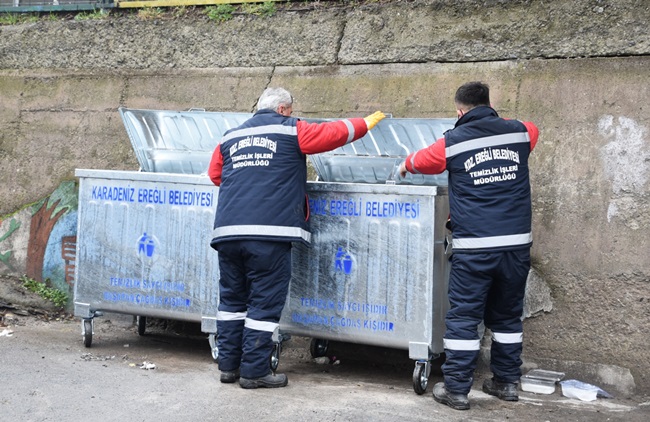 Kdz. Ereğli Belediyesi Temizlik İşleri Müdürlüğü, yoğun kar yağışının ardından kentteki 3 bin çöp konteynerini dezenfekte ediyor.