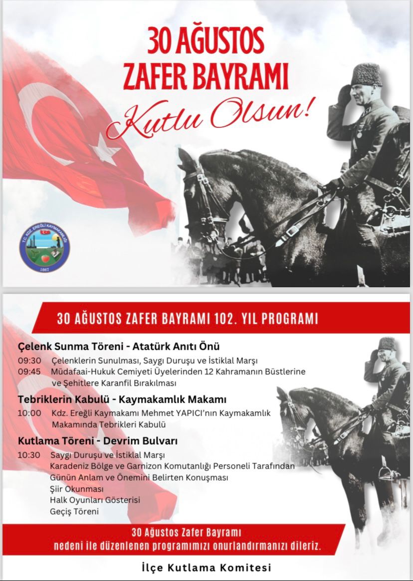 30 Ağustos Zafer Bayramı'nın tüm yurtta olduğu gibi Kdz. Ereğli’de coşku ve gururla kutlanacak.