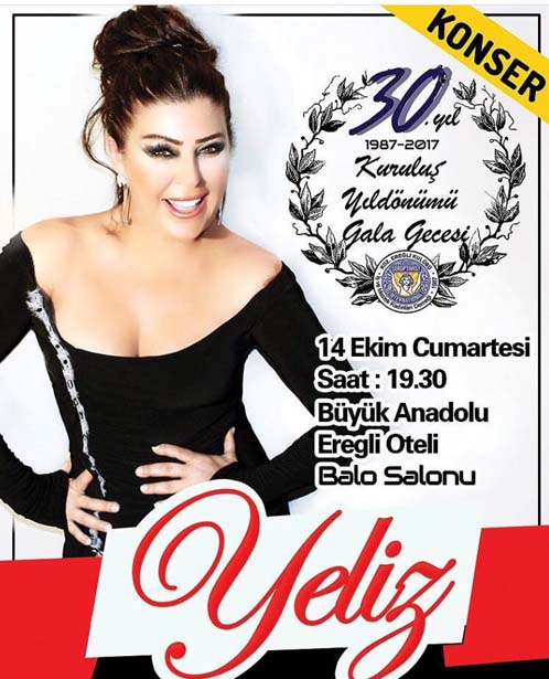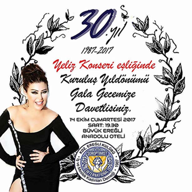 Zonguldak'ın Ereğli ilçesinde kız çocuklarının okutulması ve okullardaki eksikliklerin giderilmesi konularında yardımları olan Kdz Ereğli Soroptimist Kulübü, 30. kuruluş yıldönümü dolayısıyla 14 Ekim 2017 Cumartesi günü, Büyük Anadolu Otel Balo Salonu'nda saat 19:30'da sanatçı Yeliz'in sahne alacağı bir gala gecesi tertip etti.