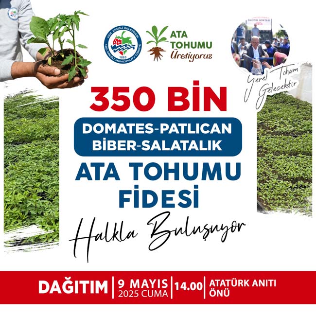 Kdz. Ereğli Belediyesi, 350 bin ata tohumu fidesini halkla buluşturuyor. 9 Mayıs 2025 Cuma günü saat 14.00’de Atatürk Anıtı önünde vatandaşlara ücretsiz domates, biber, patlıcan ve salatalık fidesi dağıtılacak.