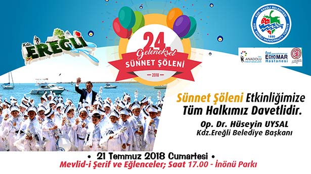 Karadeniz Ereğli Belediyesi 24.Geleneksel Toplu Sünnet Şöleni 21 Temmuz 2018 Cumartesi günü saat 17.00'de İnönü Parkı'nda gerçekleştirilecek.