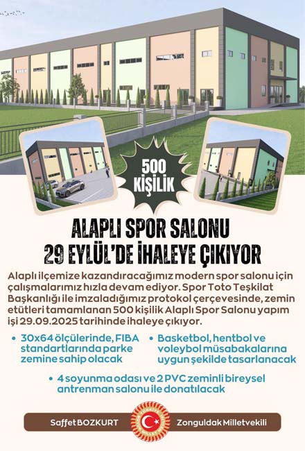"Alaplı ilçemize kazandıracağımız modern spor salonu için çalışmalarımız hızla devam ediyor. Spor Toto Teşkilat Başkanlığı ile imzaladığımız protokol çerçevesinde, zemin etütleri tamamlanan 500 kişilik Alaplı Spor Salonu yapım işi 29.09.2025 tarihinde ihaleye çıkıyor. Yeni salonumuz 30x64 ölçülerinde, FIBA standartlarında parke zemine sahip olacak, Basketbol, hentbol ve voleybol müsabakalarına uygun şekilde tasarlanacak, 4 soyunma odası ve 2 PVC zeminli bireysel antrenman salonu ile donatılacak. Alaplı’mıza değer katacak bu önemli yatırım ilçemize şimdiden hayırlı olsun." dedi