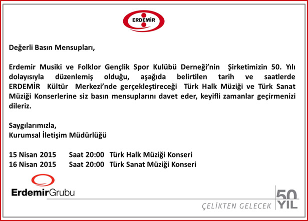 Erdemir Musiki ve Folklor Gençlik Spor Kulübü Derneği tarafından Ereğli Demir ve Çelik Fabrikaları (ERDEMİR) kuruluşun 50.yılı dolayısıyla Türk Halk ve Türk sanat Müziği konseri düzenleneceği bildirildi.