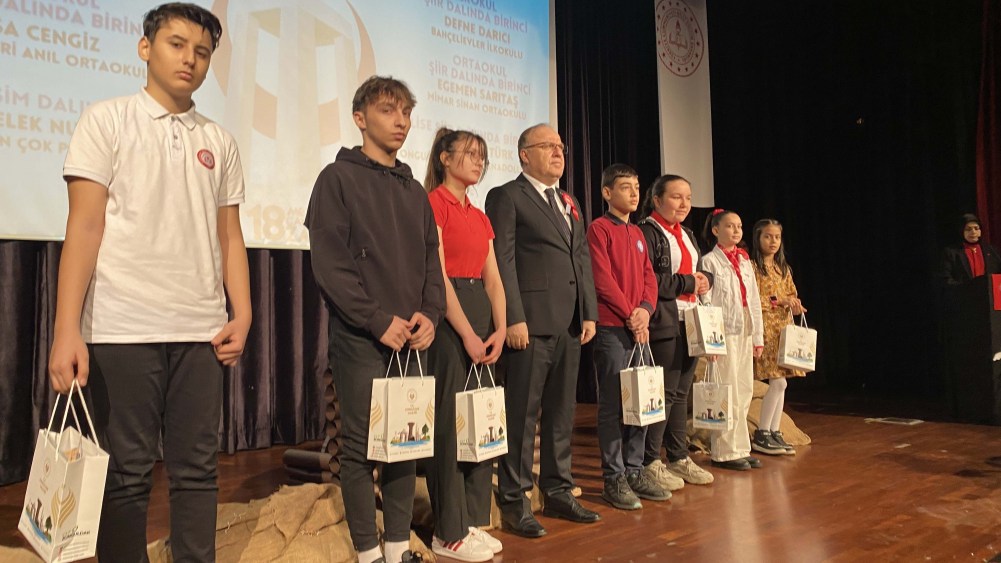 Ardından şiirler okunarak, 18 Mart Şehitleri anma günü etkinlikleri kapsamında düzenlenen şiir, kompozisyon ve resim gibi yarışmalarda dereceye girenlere öğrencilere ödülleri verildi.