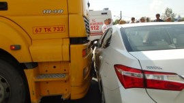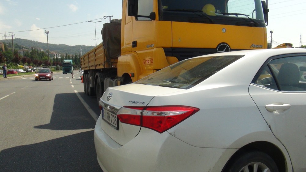 Kaza 15.45 saatlerinde Kışla Mahallesi Kışla Kavşağında meydana geldi. İddialara göre Tır sürücüsü İhsan A. (37) idaresindeki 67 TK 732 plakalı çekici 67 TU 021 plakalı dorse Ahmet H. O. (21) idaresindeki 81 KH 736 plakalı otomobile çarptı. Tır çarpmanın etkisi ile otomobili önüne aldı. TIR ve otomobil yaklaşık 60 metre sürüklendikten sonra durabildi. Kazada şans eseri yaralanan olmazken, TIR’da ve otomobilde maddi hasar meydana geldi. Kazadan dolayı trafikte aksama yaşanırken araçların yoldan kaldırılmasının ardından trafik normale döndü. Savcılık kaza ile ilgili soruşturma başlattı.