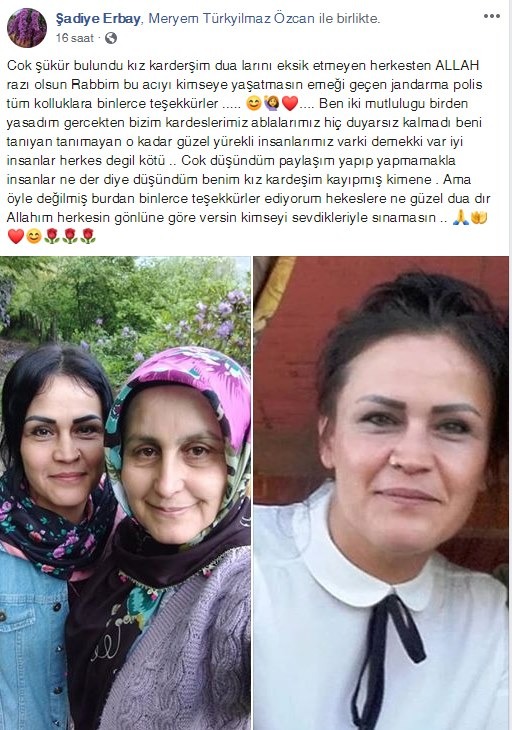 7 gündür haber alınamayan Almanya'da yaşayan Zonguldak'ın Kozlu İlçesindeki annesini Ramazan bayramında ziyarete gelen evli ve 3 çocuk annesi 37 yaşındaki Hülya Türkyılmaz kolluk kuvvetlerinin üstün çalışmasıyla bulundu. Türkyılmaz'ın yakınları sosyal medya üzerinden yaptığı paylaşımda, destek olan herkese teşekkür ederek, "Başta Jandarma ve polis ekiplerine, bizi seven tüm insanlara desteklerinden dolayı çok teşekkür ediyoruz. Kızımız evine döndü. Allah herkesten Razı Olsun paylaşımı yapıldı.
