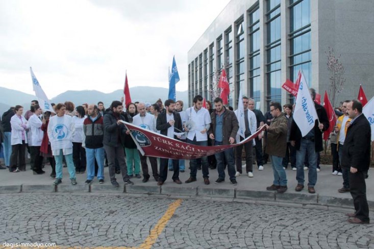 Zonguldak'ın Ereğli ilçesinde Türk Sağlık Sen çalışanları hastane binası önünde iş bırakma eylemi gerçekleştirdi.