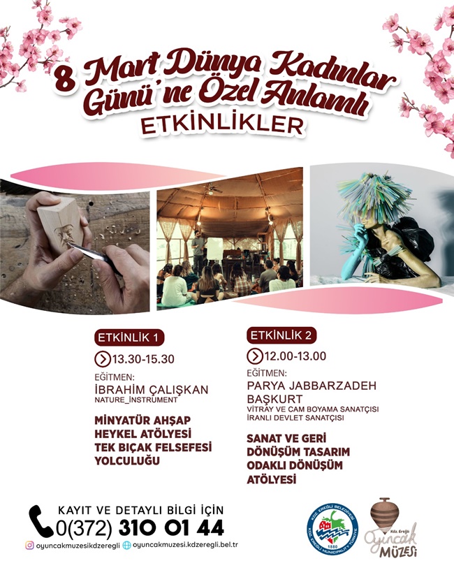 Oyuncak Müzesi Müze Atölyede 8 Mart Dünya Emekçi Kadınlar Gününe özel olarak,  8 Mart Pazar günü 12.00 ile 15.30 saatleri arasında iki farklı atölye gerçekleştirilecek. İlk olarak; eğitmen Parya Jabbarzadeh Başkurt eşliğinde Sanat ve Geri Dönüşüm Atölyesi, ardından eğitmen İbrahim Çalışkan eşliğinde ise “Tek Bıçak Felsefesi Yolculuğu” Minyatür Ahşap Heykel Atölyesi gerçekleştirilecek.