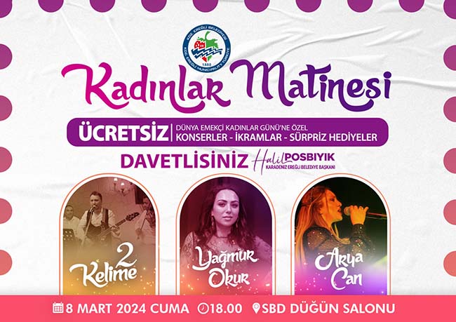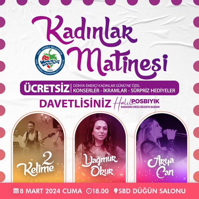 Kdz. Ereğli Belediyesi 8 Mart Dünya Emekçi Kadınlar Günü dolayısıyla ”Kadınlar Matinesi” düzenliyor. Ücretsiz etkinlikte Yağmur Okur, Arya Can ve 2 Kelime sahne alacak.