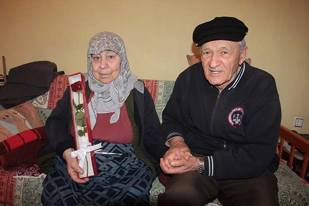 Zonguldak'ın Ereğli ilçesinde yaşayan 79 yaşındaki İsmail Tuna, 58 yıldır evli olduğu 78 yaşındaki eşi Yüksel Tuna'ya sevgililer gününde çiçek alarak sevindirdi. İlerleyen yaşlarına rağmen bir birlerini halen sevdiklerini söyleyen yaşlı çift aşklarının sırrını muhabbet, sevgi ve saygı olarak açıkladı.