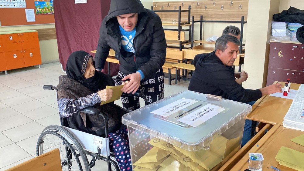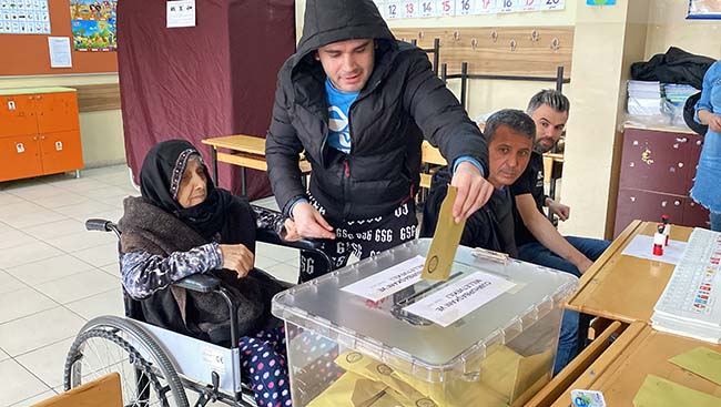 Zonguldak'ta yaşayan 90 yaşındaki Hacer Baduroğlu, Cumhurbaşkanlığı 2. tur seçimi için tekerlekli sandalye ile sandık başına geldi.
