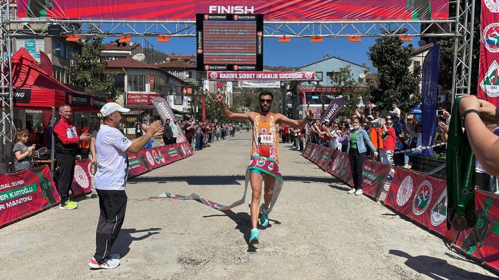 Safder Kartoğlu, yarı maraton birincisi Ömer Alkanoğlu'nu tebrik etti. Yarışmada dereceye girenler madalya ile ödüllendirildi.