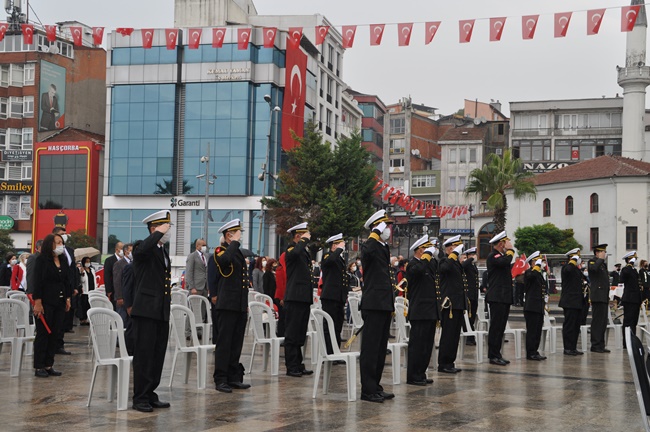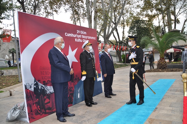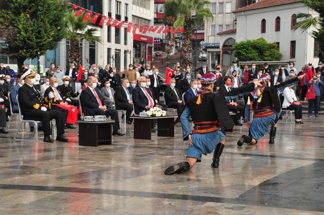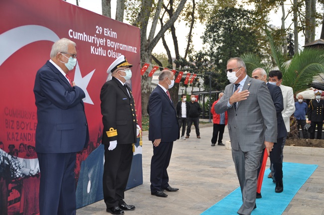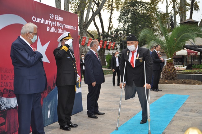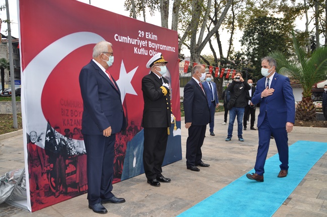 Pandemi tedbirleri çerçevesinde, sosyal mesafe kuralına uygun olarak, protokol sırasına göre gerçekleştirilen programda, protokol ve kurum temsilcileri, ellerini göğsüne götürerek kutlamaları gerçekleştirilerek, kabul ettiler. Karadeniz Bölge Komutanı Tuğamiral Taner Gün’ün, Harp Malulü Gazilerin geçişi esnasında selam durarak kutlamaları kabul ettiği törende son olarak basın mensupları protokol üyelerinin 29 Ekim Cumhuriyet Bayramı’nın 97. Yılını kutladılar.